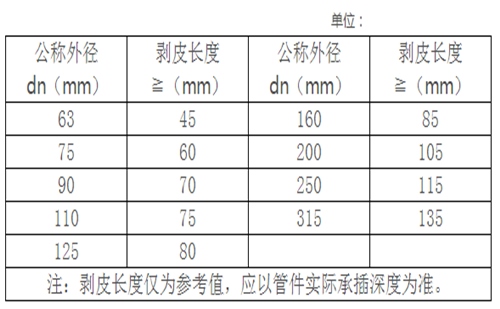 1、用專用切割機切斷鋁合金襯塑復合管材,切面(斷面)應平齊垂直于管材軸線,電熔連接剝皮長度見下表。