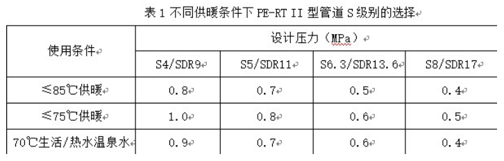 由以上表可以看出,PE-RT II型管道一般選用S5系列即可滿(mǎn)足小區(qū)集中供暖管網(wǎng)的運(yùn)行溫度、1、壓力要求