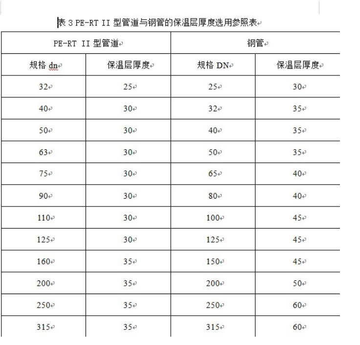 PE-RT II型供熱管道與鋼管相同,都采用工作管、保溫層、外護(hù)管三位一體的保溫結(jié)構(gòu),由于PE-RT II型材料的導(dǎo)熱系數(shù)為鋼管的1%,即管材本身具有較好的保溫性能,且PE-RT II型管道、保溫層、外護(hù)管的熱膨脹系數(shù)基本一致,會(huì)成為一個(gè)整體,不易分層、脫落,管道保溫效果優(yōu)于鋼管,在相同的外界溫度條件下,更節(jié)約保溫材料。以輸送80℃熱水為例,相同流量的外界溫度下,PE-RT II型管道與鋼管的保溫層厚度選型見(jiàn)表3