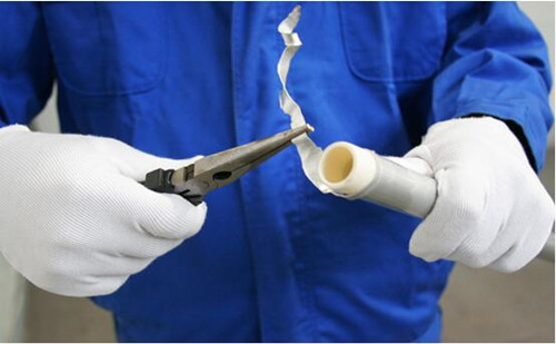 步驟二:管材與管件的連接:拔出后,應立即將管材沿管材中軸線均速插入到管件中,直至借口上卷曲的熔瘤到達鋁皮的切割位置為止,并保持這一位置,穩(wěn)定幾分鐘冷卻。同樣地,插入過程中不能帶任何旋轉的動作,在規(guī)定的冷卻時間內,應扶好管材、管件,使它不受扭、彎和拉伸。